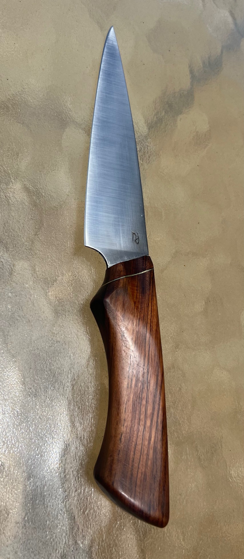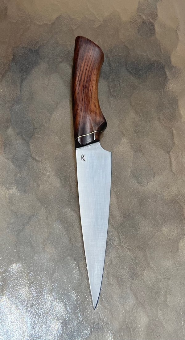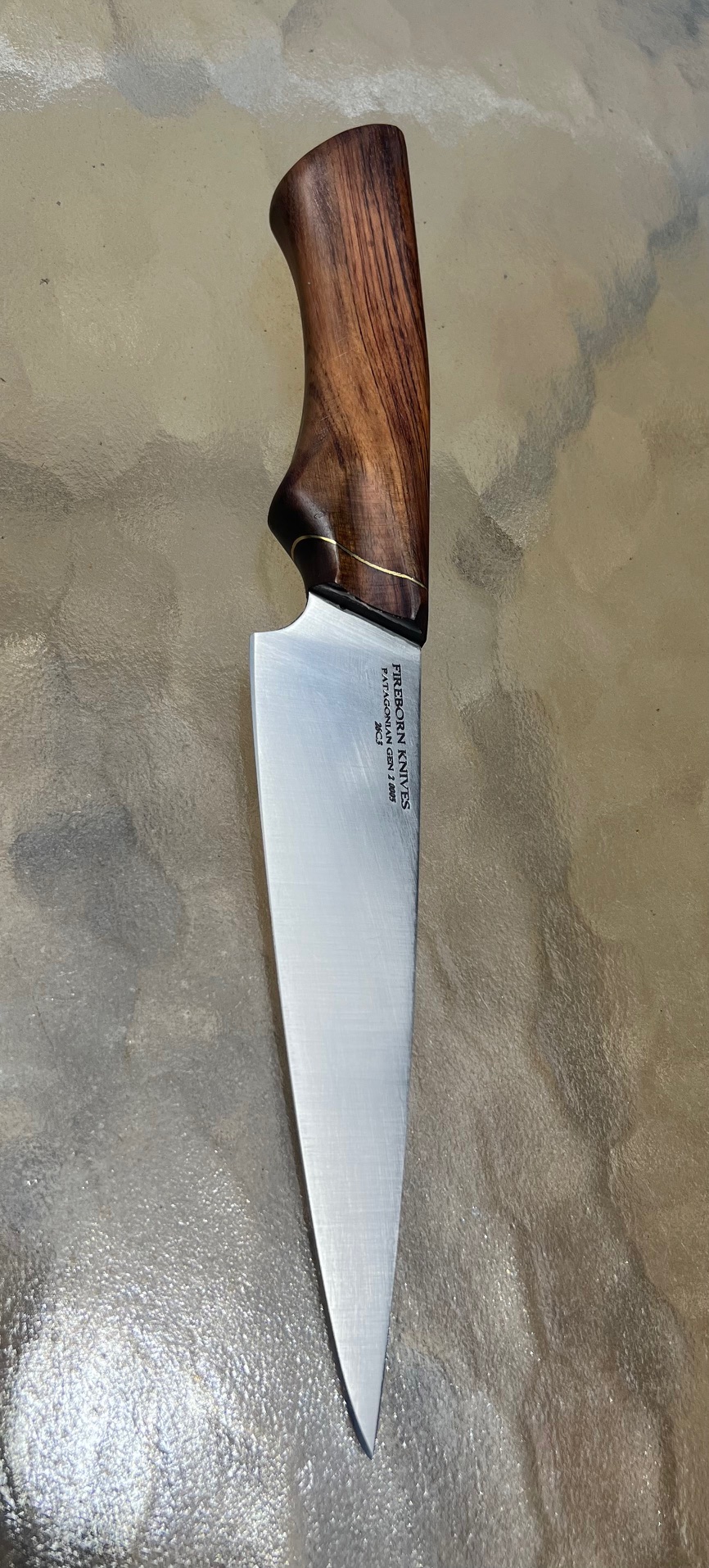 The Patagonian Utility Chef’s knife is the premiere knife line in the Fireborn collection. The utility knife is the go to knife in the kitchen. Versatile enough to handle light chef knife duties, yet nimble enough to make precise cuts where they matter. Each handle is imported directly from Argentina and the mountains of Patagonia. Every piece is unique and each wood can be chosen by the client as available. This particular handle is made from Espina Corona wood. The blade is made from the incredible 26c3 high carbon steel, which is capable of holding an edge sharper than a razor blade for much longer than most knives.
