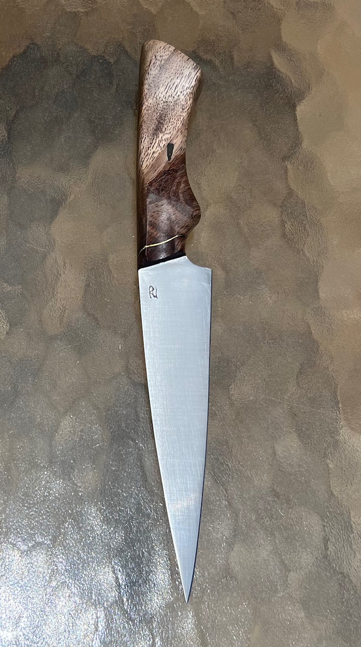 The Patagonian Utility Chef’s knife is the premiere knife line in the Fireborn collection. The utility knife is the go to knife in the kitchen. Versatile enough to handle light chef knife duties, yet nimble enough to make precise cuts where they matter. Each handle is imported directly from Argentina and the mountains of Patagonia. Every piece is unique and each wood can be chosen by the client as available. This particular handle is made from Virapita wood. The blade is made from the incredible 26c3 high carbon steel, which is capable of holding an edge sharper than a razor blade for much longer than most knives.