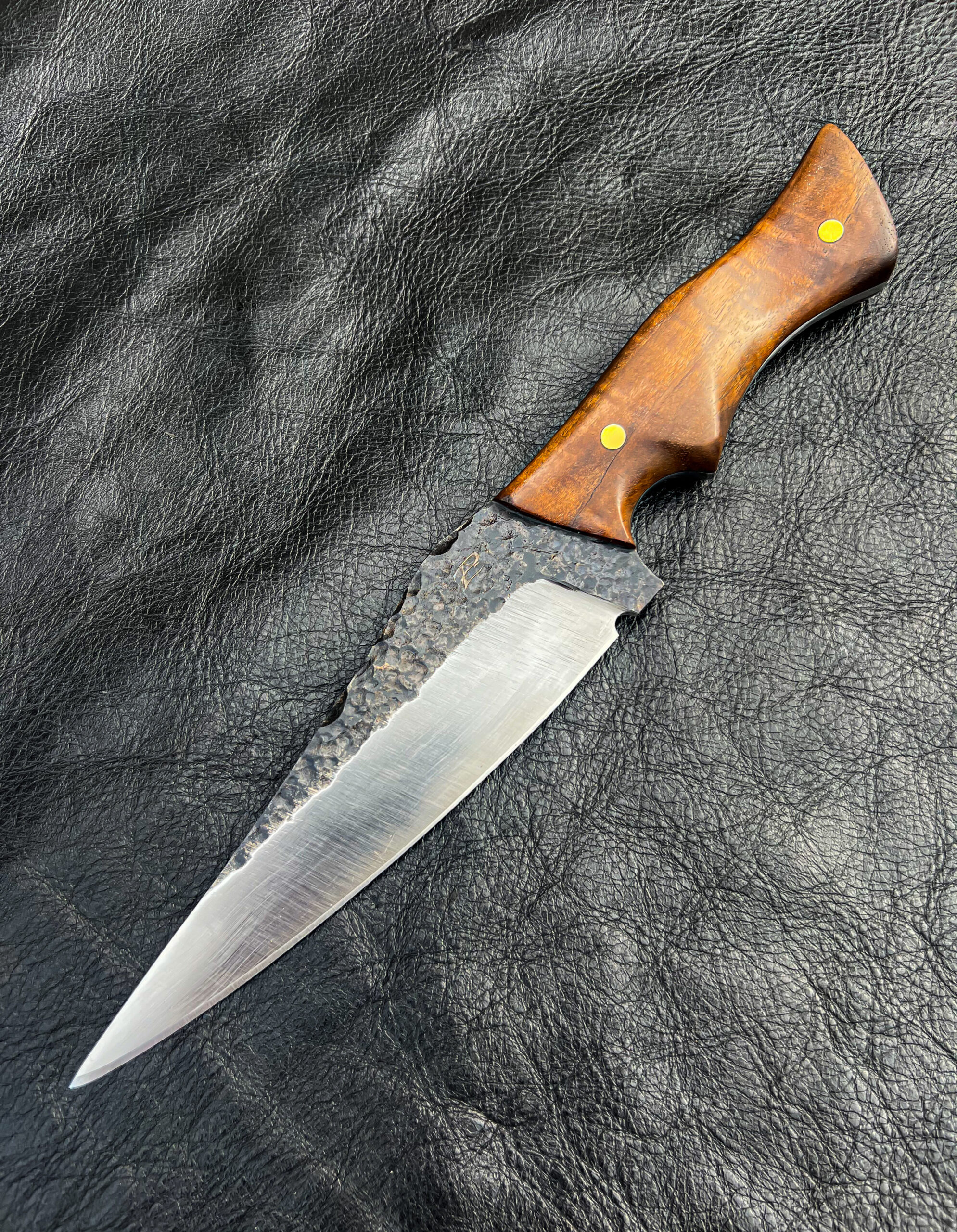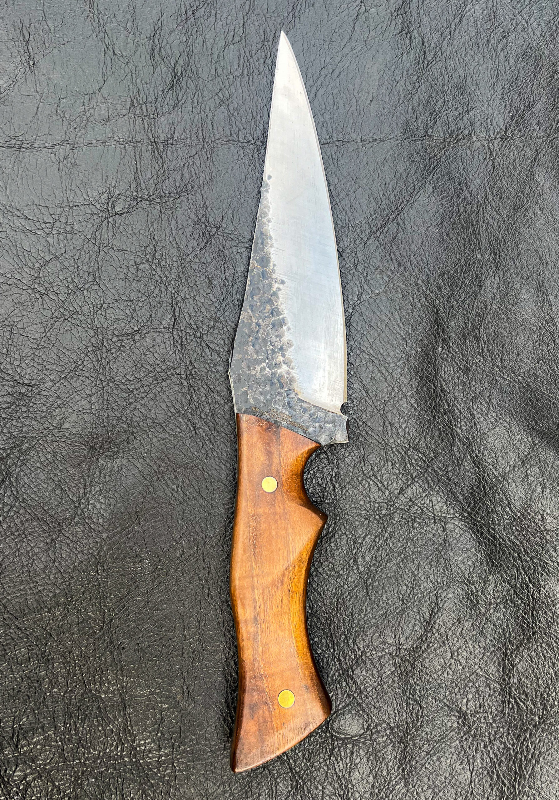 This 7 inch blade will be the go to knife for meal prep in the woods! Perfect for hunters, hikers, and overlanders alike as it can handle almost any task thrown at it.  Made from some thicker 80CrV2 high carbon steel that was forged to shape, it is about as robust as they come. This knife will be ideal for preparing those fresh meats surely to have been brought or hunted on such a trip. Unlike the light weight kitchen knives that I make, this knife is a heavy duty tool.  Enjoy the peace of mind of having one of the toughest hand crafted knives out there.